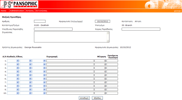 Pansophic Stock Control & Web Requisitions System is a complete system for the maintenance of stock items requisitions from the various branches / departments of the organization. Consists of two modules (which can be supplied separately). The Web Requisitions module which is a web based application and manages the requests at the branch / department level and the Stock Control module which manages the organization's stock items at the Supplies department and organization's Warehouses.